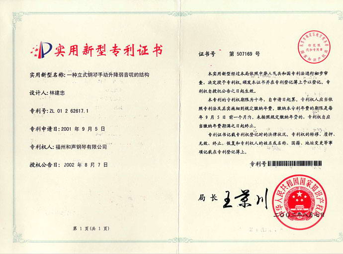 一种立式钢琴手动升降弱音呢的结构(实用新型专利,专利号:ZL 01 2 62617.1) 2018-06-28 10:08:17