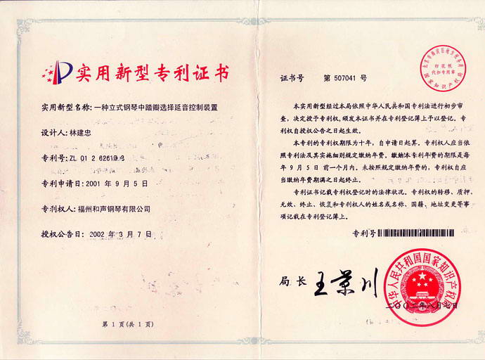 一种立式钢琴中踏瓣选择延音控制装置(实用新型专利,专利号:ZL 01 2 62616.8) 2018-06-28 10:09:19