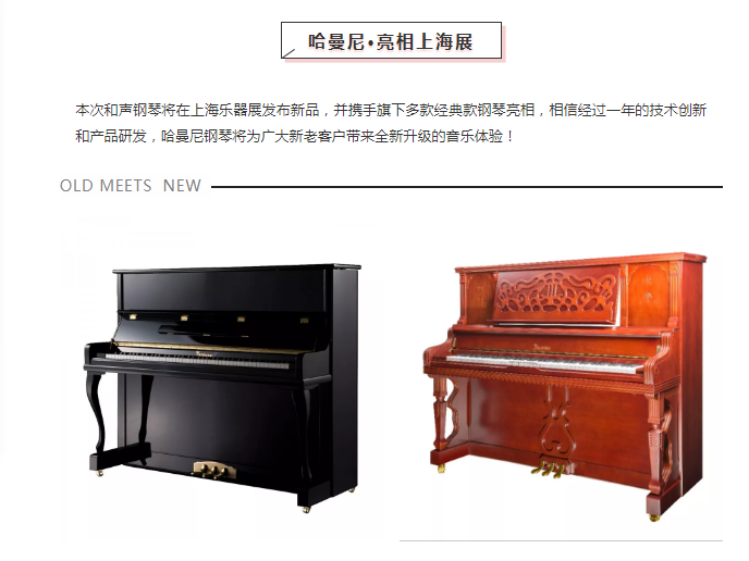 哈曼尼钢琴诞生于1810年英国,从锋芒展露到王者加冕,哈曼尼钢琴一直秉承皇家高标准,专门为上流高端社会子弟打造学习所需钢琴品牌,1985年,哈曼尼吸引了国内钢琴制造厂商的青睐,双方多次跨国沟通,最终达成一致,将哈曼尼带入中国。作为中国乐器行业50强,钢琴制造业10强,中国乐器协会副理事长单位、钢琴分会副会长单位,和声公司已经连续十八年参加这次行业盛会!