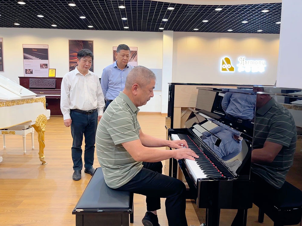 和声钢琴公司董事长刘小汀对校方领导的到来表示热烈欢迎。在公司领导的引领下,校领导先后参观了和声钢琴公司的音板静置养生房、恒温恒湿钢琴生产车间及多功能钢琴展厅。体验“哈曼尼”钢琴高品质的音色、卓越的弹奏效果,大家纷纷表示“哈曼尼钢琴是真正可以看得见的好钢琴”。了解了和声钢琴公司自成立以来改革创新发展的历程和当前多项领先行业的钢琴研发技术,感受了国内钢琴制造技术领航者的实力。